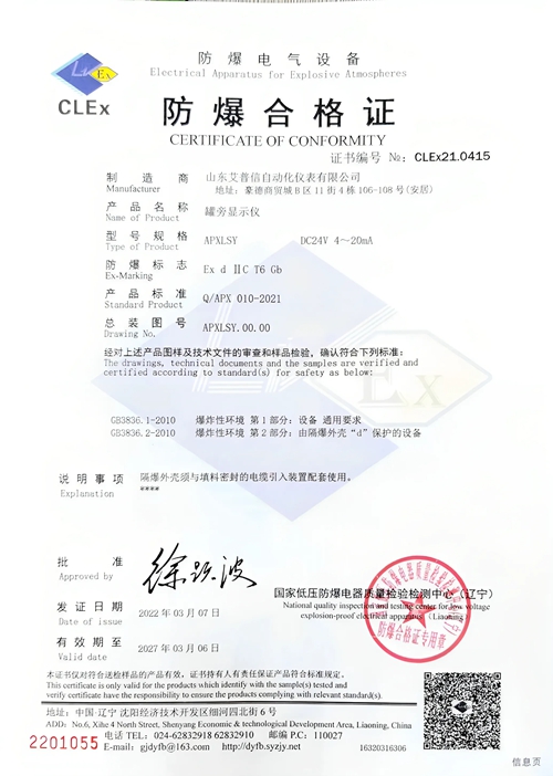 標(biāo)準(zhǔn)款音叉物位開關(guān),優(yōu)質(zhì)防爆鑄造鋁殼,不銹鋼銘牌,sus316叉體材質(zhì)。 型號(hào):APXYC504 應(yīng)用:液體/粉體 供電:24VDC/220AC 輸出:繼電器(DPDT) 連接過程:G1''螺紋 叉體長(zhǎng)度:100mm 介質(zhì)溫度:-30℃-80℃ 壓力:≤4MPa 防爆等級(jí):Exd IIC T6 Gb 防護(hù)等級(jí):IP65
